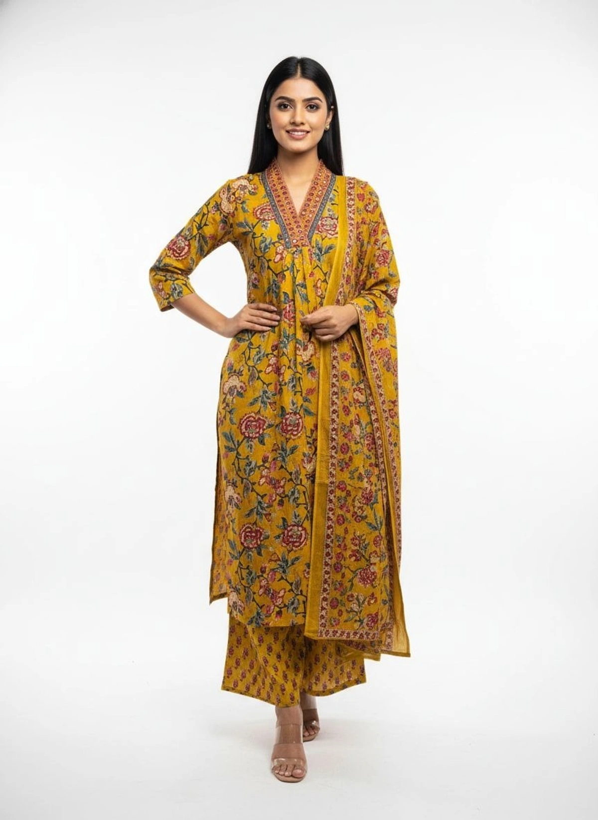 Dupatta: Lightweight matching printed dupatta with decorative border edges.