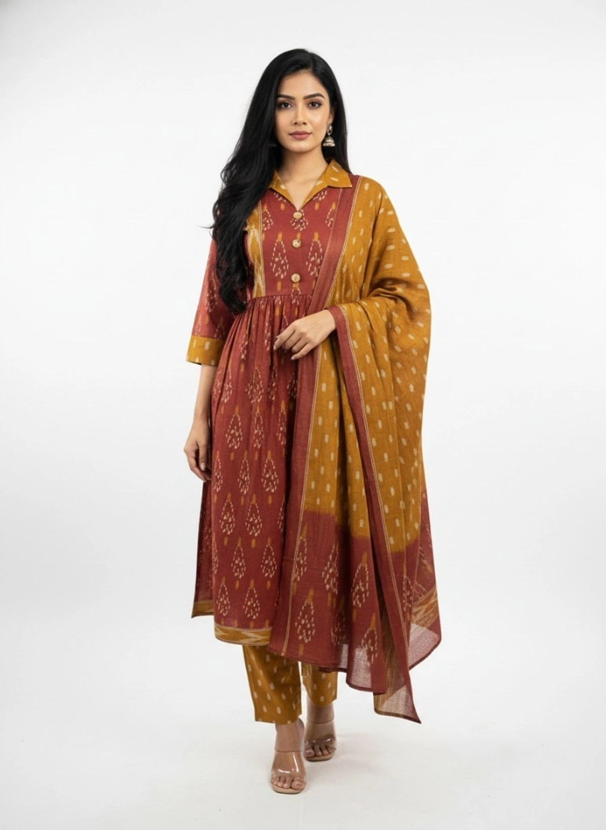 Infuse your ethnic wardrobe with contemporary style in this Terracotta and Mustard Ikat Print Suit Set. The kurta features a smart shirt-style collar and a functional button-down bodice that transitions into a beautifully gathered waistline for a soft, feminine flare. Crafted from breathable cotton, the set is adorned with a traditional Ikat-inspired geometric pattern. Complete with matching printed trousers and a multi-tonal dupatta, this three-piece ensemble is perfect for office wear, semi-formal meetings, or stylish daytime outings.
