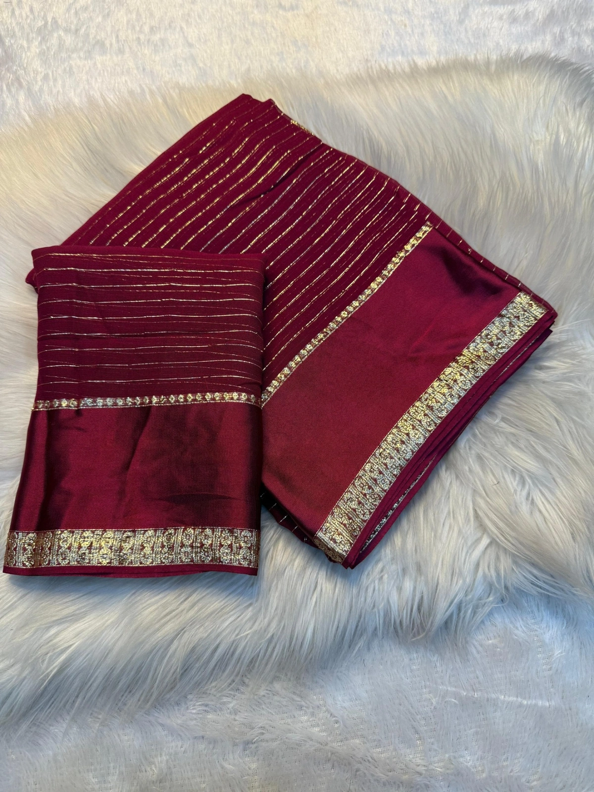Blouse: Includes a matching unstitched maroon silk blouse piece with gold border accents.