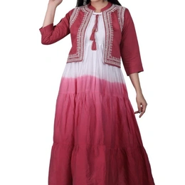 Make a grand entrance with this stunning Pink and White Ombré Tiered Anarkali set. This ensemble features a breezy, multi-tiered maxi dress with a beautiful color-bleed effect, transitioning from a crisp white bodice to a deep fuchsia pink hem. The look is elevated by a coordinated, short ethnic jacket (Koti) featuring intricate white thread-work embroidery and shimmering mirror-style accents. Whether you are attending a mehendi ceremony or a festive dinner, this layered look offers the perfect blend of traditional craftsmanship and modern silhouette.